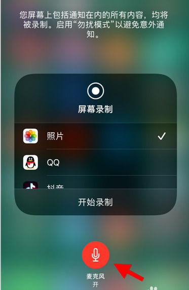 2、在屏幕录制设置界面,将麦克风打开,返回上一界面。