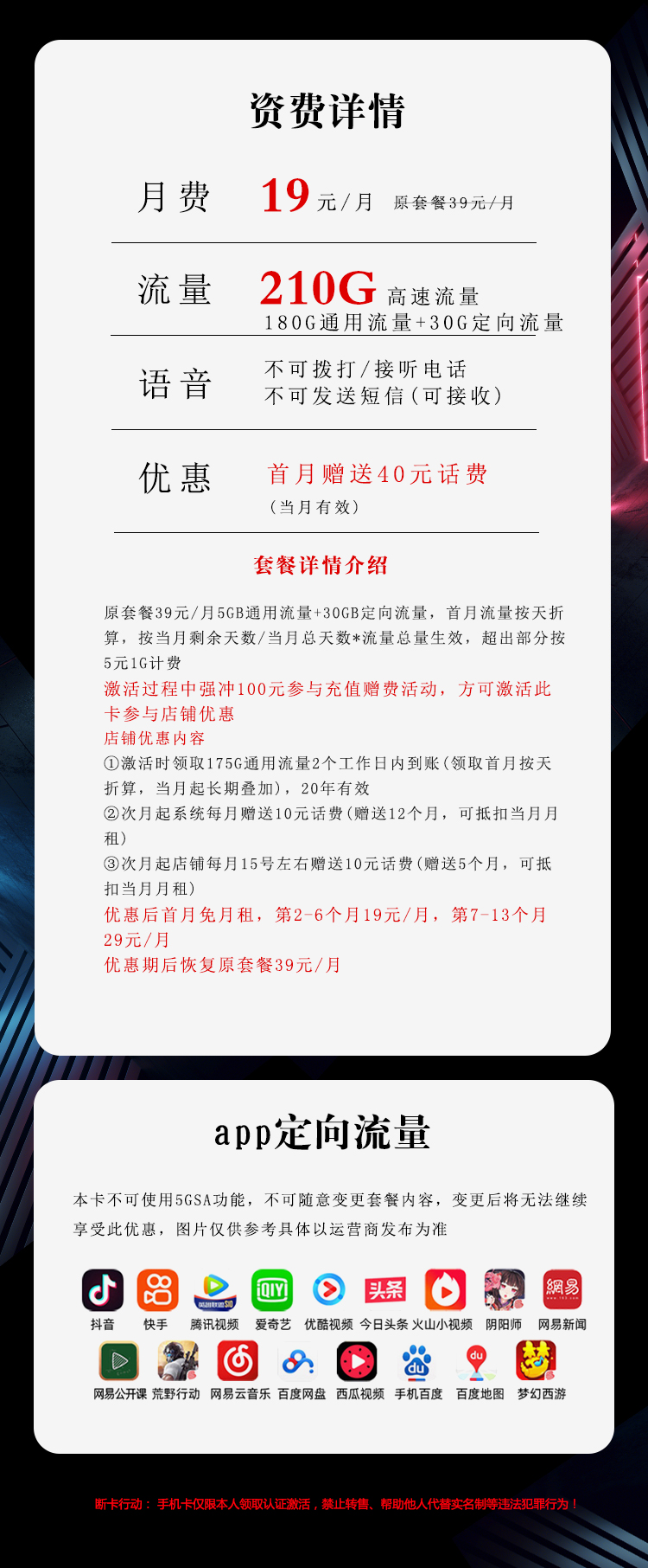 电信19元210G沧火卡新(无语音 爆款) 180G通用流量+30G定向流量