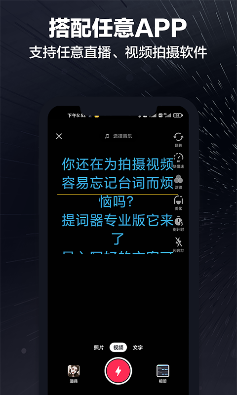 对于经常需要拍视频或做演讲的人非常友好,作为一款具有拍摄和题词的软件,这款软件极大地减少了用户因为忘词而重新拍摄的次数,并且软件内支持语音输入台词,减少了用户打字的麻烦,还能悬浮题词,一个手机就能解决所有台词问题。